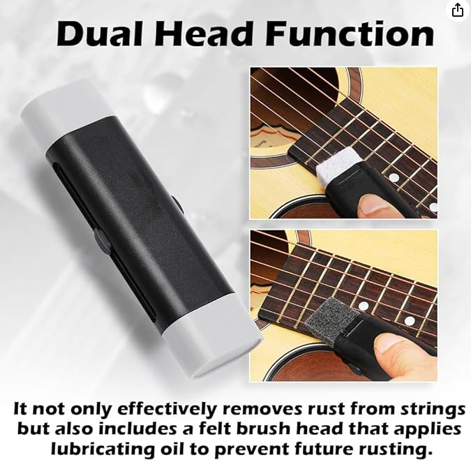 Give your strings the care they deserve with this dual-headed cleaner. One side removes rust and grime, while the felt brush applies protective oil to keep them smooth and lasting longer. The 360° cleaning tool reaches every angle for faster, deeper results. Compact and portable, it fits easily in your gig bag. Built with a durable shell and microfiber pads, this cleaner is perfect for guitars, basses, violins, and more. Stay stage-ready anytime, anywhere.